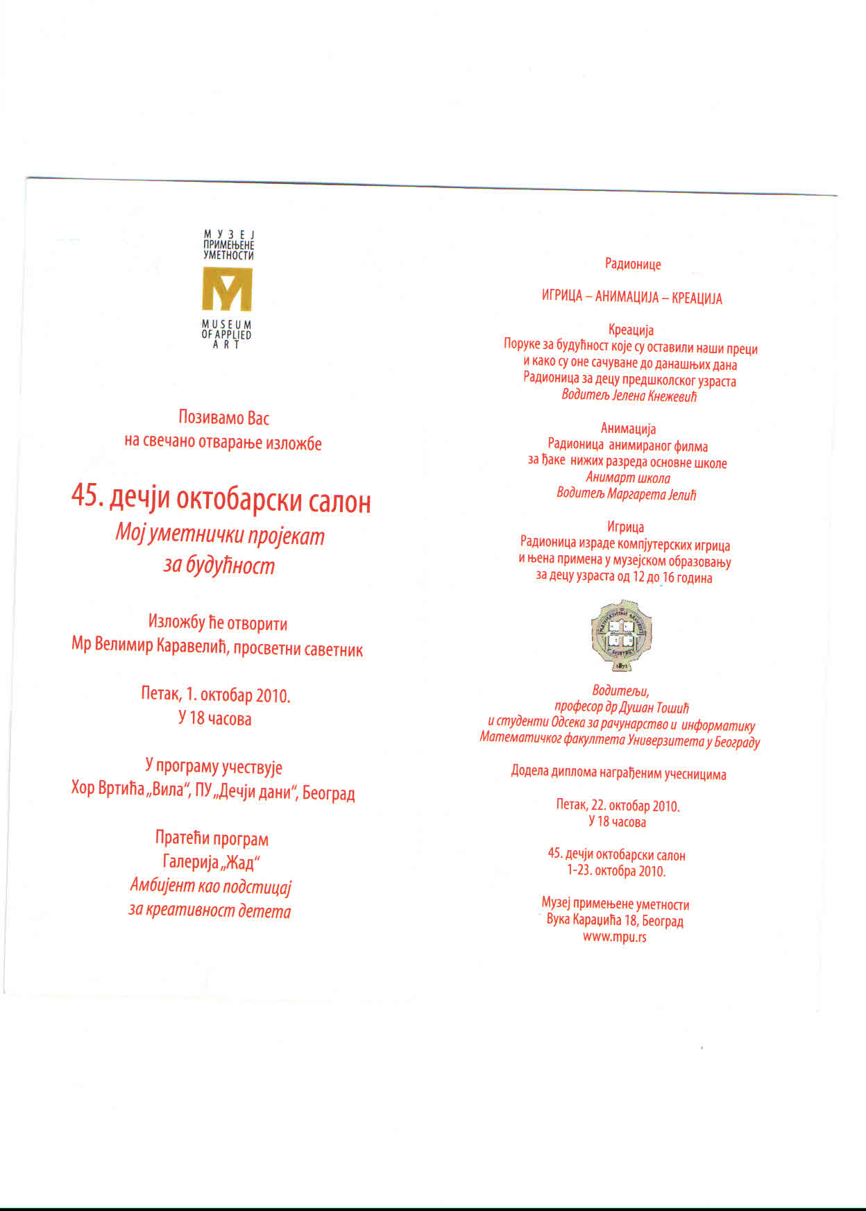 У оквиру промотивних активности нашег Факултета и сарадње са осталим сродним и мање сродним институцијама, у Музеју примењене уметности у склопу одржавања 45. октобарског салона, између осталог биће организована секција под називом Игрица. Основна идеја јесте да се публици представи начин израде игрица, као и да се укаже на то да игрица осим забавног може имати и едукативни карактер и да се може примењивати и наћи своје место и у музејима. Публици ће се са Математичког факултета представити професор Душан Тошић, као и неколицина наших студената.